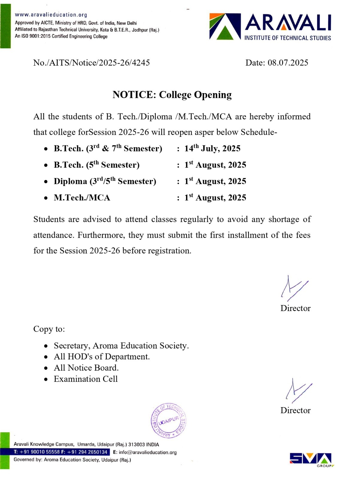 AITS, a constituent college of Aravali Group, recognized by AICTE (Govt. of India), ISO 9001:2015 certified, and also affiliated with the Rajasthan Technical University, Kota (Raj). AITS is the NAAC accreditation, with A-Rank College by RTU, Kota. AITS actively co-create curriculum activity, the creation of competent engineers, the development of competencies with experiential learning, and achieves good results with ISRO membership. We are committed to providing the best education, training, placements, & infrastructure for Technical Education such as B.Tech., Diploma of Engineering, M.Tech., and MCA.